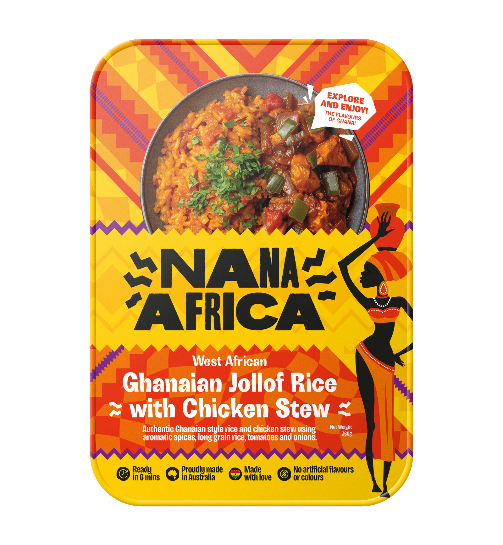 Vegetables (35%) (Onion, Red Capsicum, Crushed Tomatoes (Food AAcid (330)), Diced Tomatoes) Cooked Basmati Rice (35%) (Water, Basmati Rice, Salt), Free Range Diced Chicken (200%) Olive Oil, Tomato Paste (Food Acid (330)), Salt, Crushed Garlic, Ginger, Scotch Bonnet Peppers, Chicken stock (v) (Contain Natural Flavours), Spices, Crushed Chili.